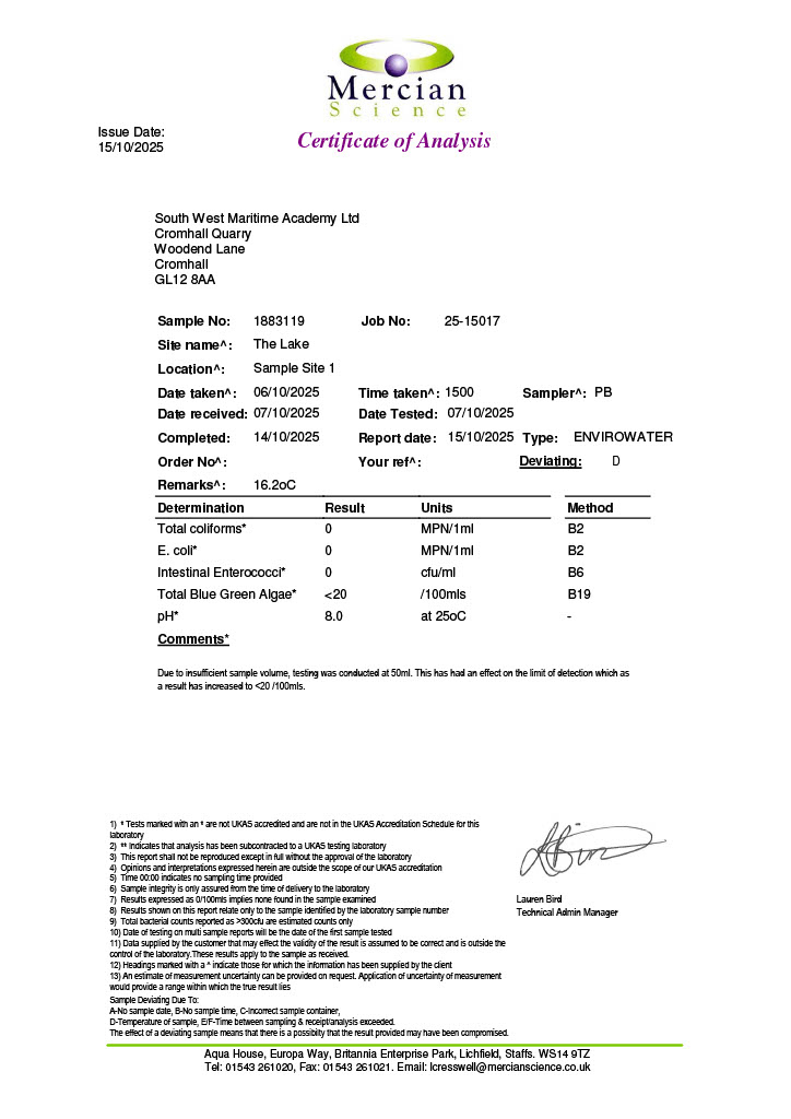 We’ve recently received the latest Certificate of Analysis for The Lake from Mercian Science, and we’re thrilled to share the results. As part of our commitment to safety, we regularly test the water. These new results, based on samples taken on October 6, 2025, show fantastic water quality.